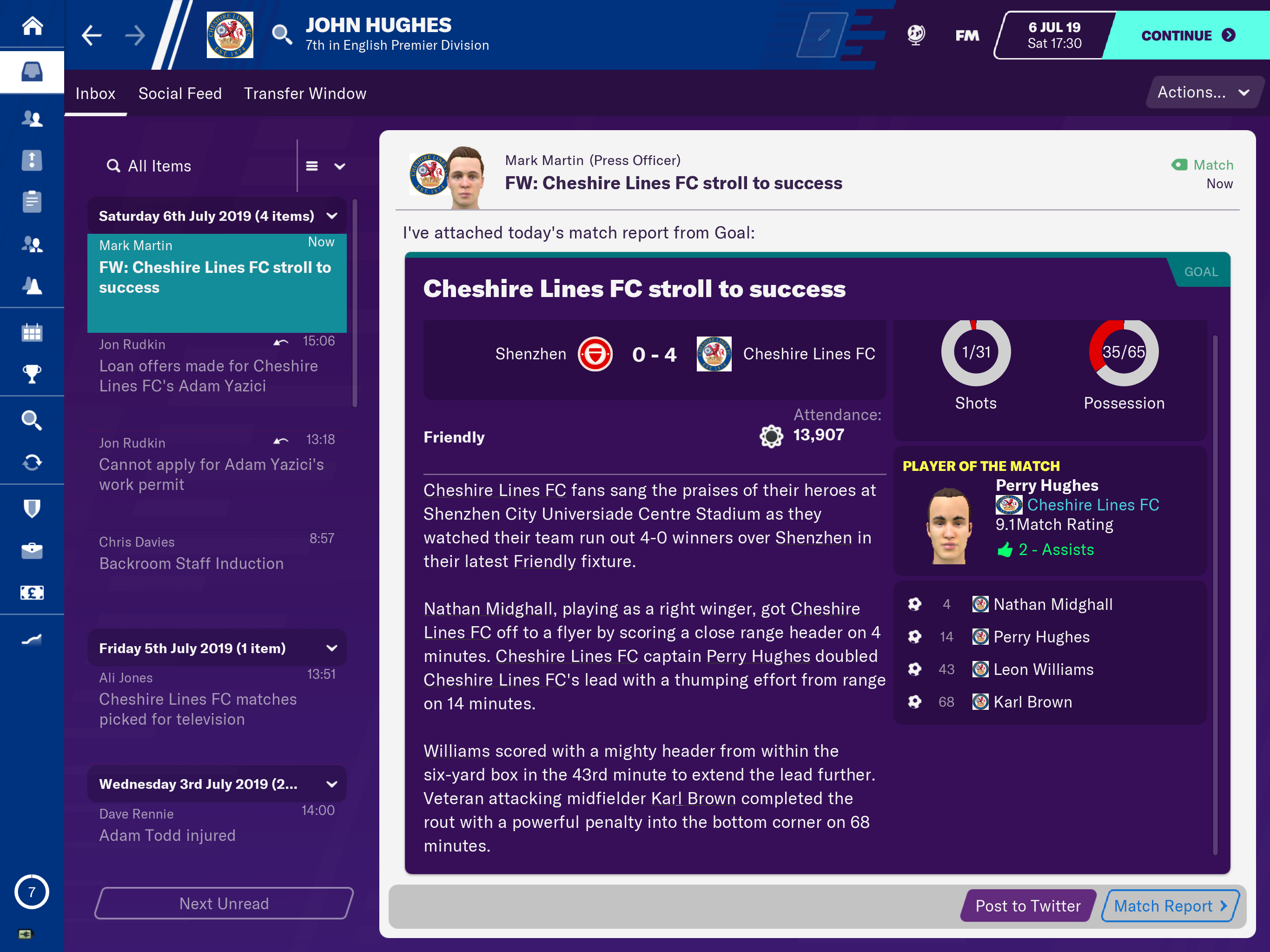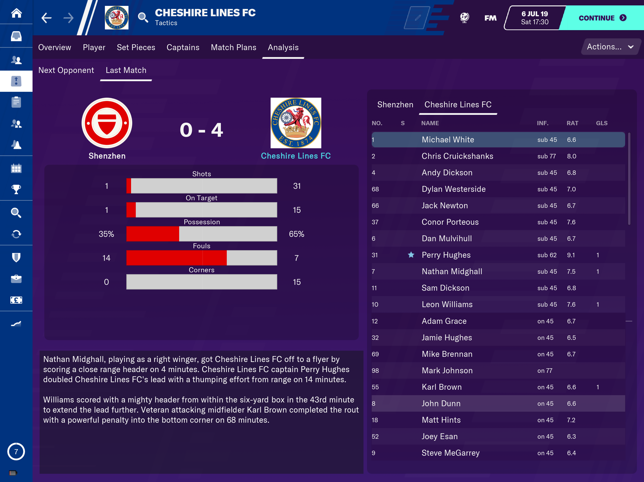 Given this is a football game you’ll be glad to hear we did eventually get to play our first preseason tour in China. Obviously complying with social distancing rules we are absolutely hammered Shenzhen 4-0 with everybody getting a game despite strong protest from newly crowned player of the season who had clearly spent too much time watching the Michael Jordan documentary. Here is the match report: