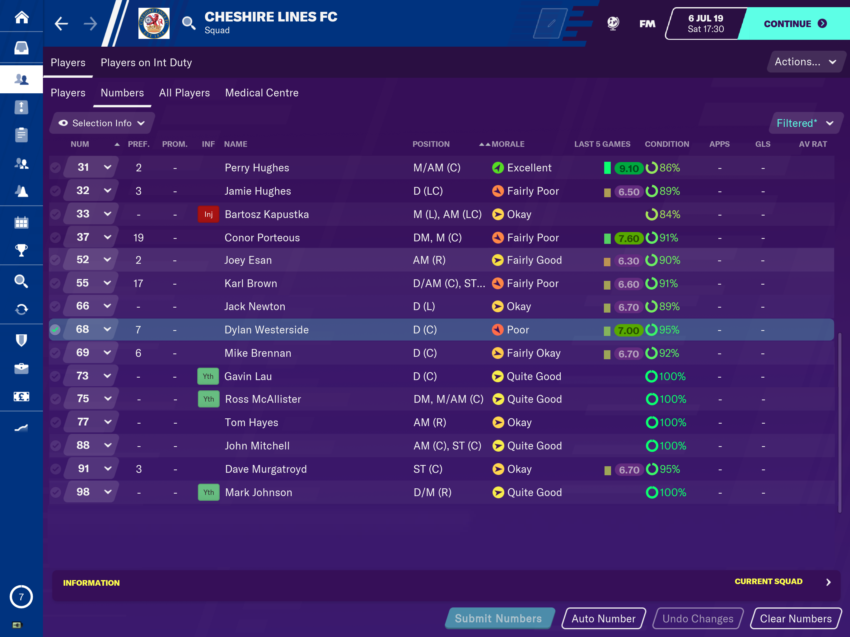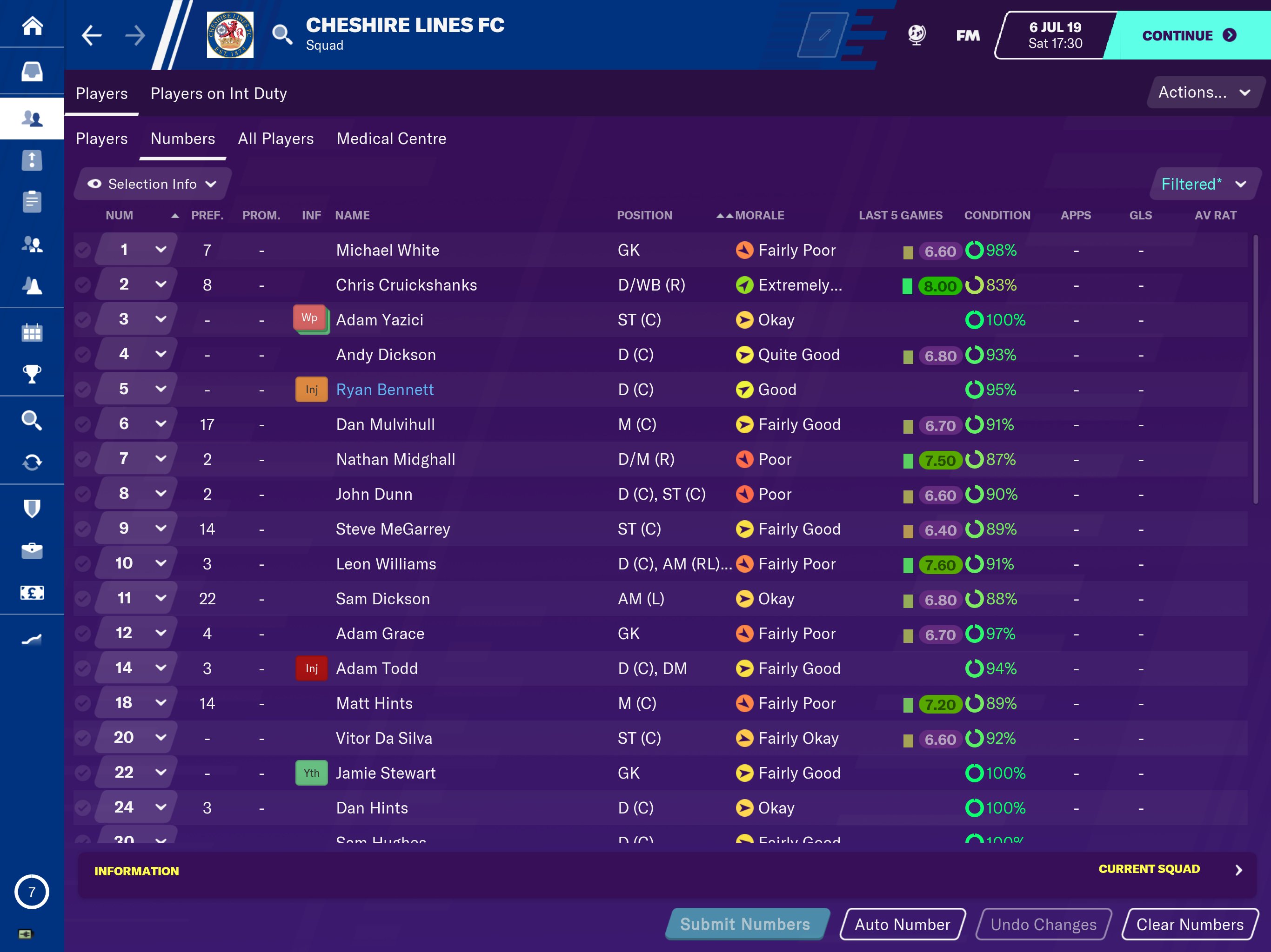 We started by allocating squad numbers. The lads have been invited to suggest their preferred number but with money not having bothered it was left open to the discretion of some very unreliable hands to make what were quite frankly questionable decisions! Suffice to say that if you’ve got the numbers they will have to, with the rest getting random at best. Here is a list of the final squad numbers;